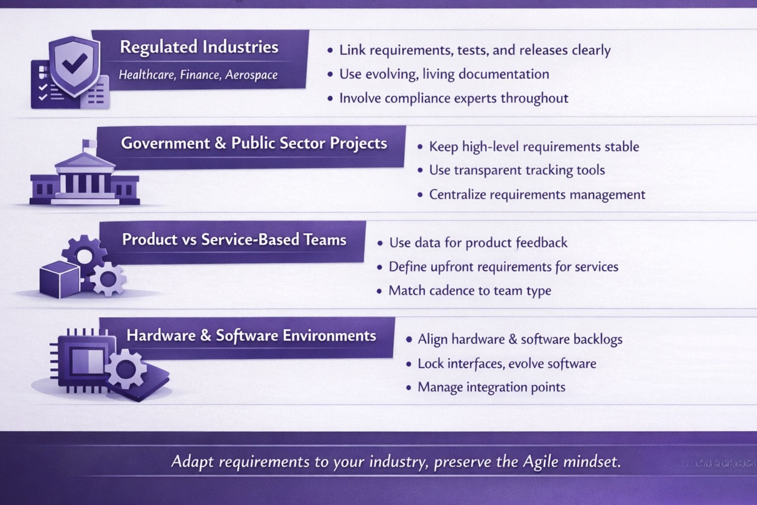 Here is how Agile requirements shift across common industry contexts.