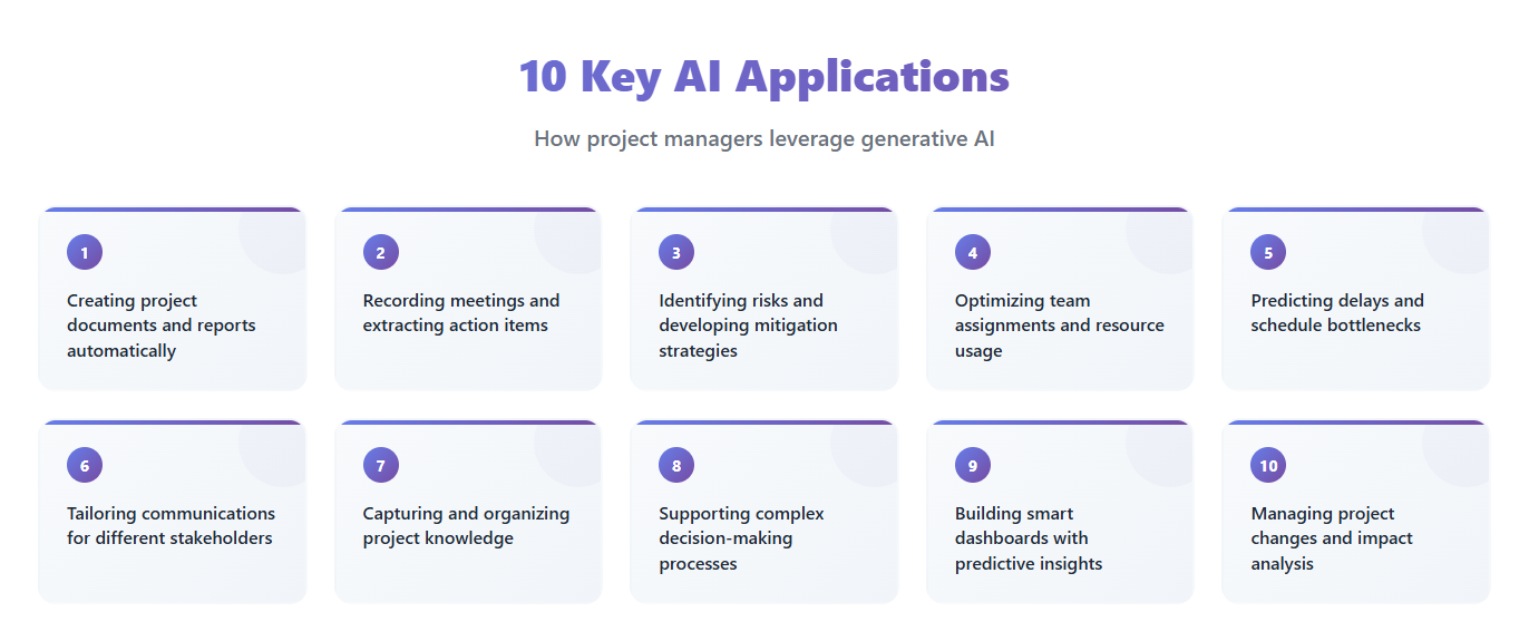 Clear communication drives successful projects. The practical application of generative AI for project managers includes: