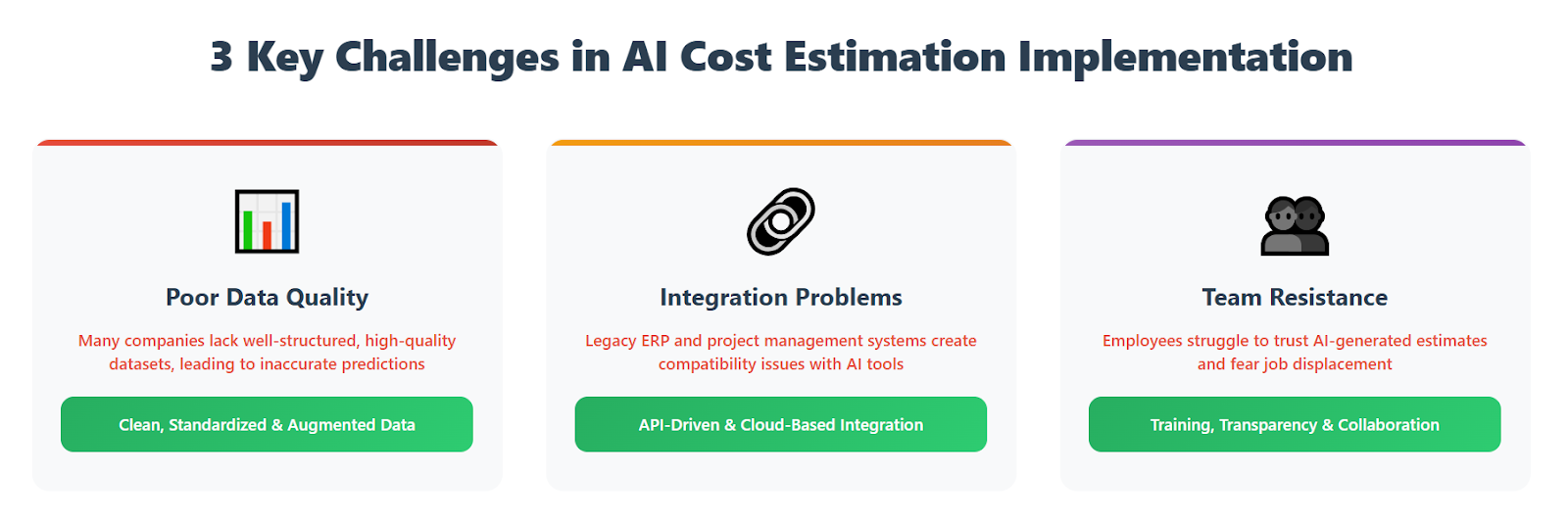 Implementing AI cost estimation brings powerful benefits, but success requires overcoming key challenges. Here's how to identify and solve common implementation hurdles.