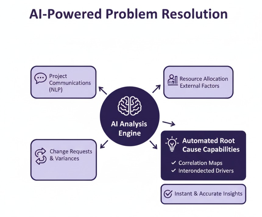 AI transforms root cause analysis by automatically connecting the dots across multiple project dimensions. Traditional analysis requiring hours of manual investigation becomes instant and accurate.