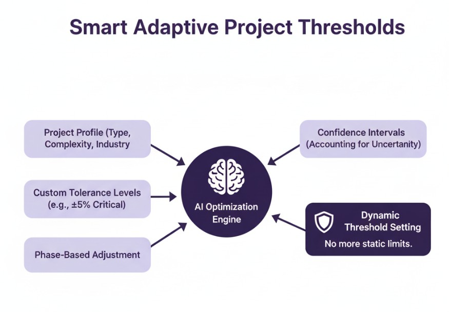 AI creates adaptive thresholds that automatically adjust based on project characteristics and historical data. Static thresholds often generate false alarms or miss critical issues.