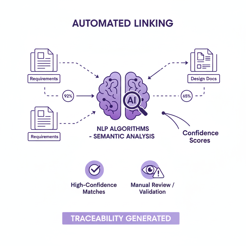 - Execute automated linking using NLP algorithms that analyze requirement text and identify semantic relationships