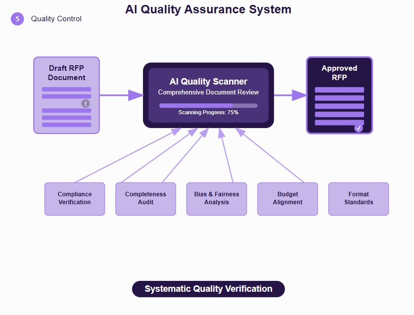 The beauty of AI quality checks lies in their thoroughness and consistency. Unlike manual reviews that might miss subtle issues, AI systematically examines every aspect of your RFP against established criteria and best practices.