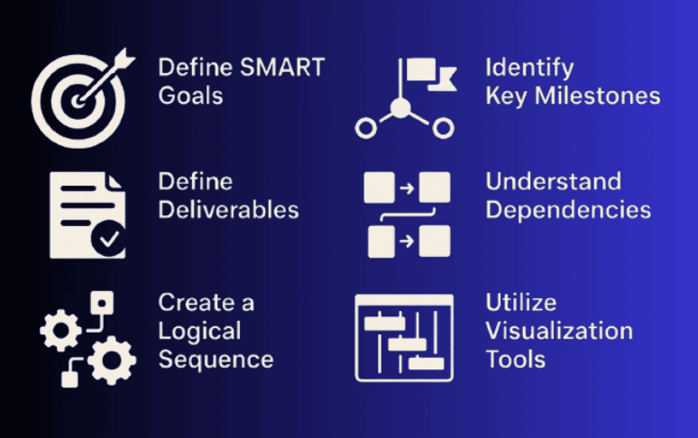 - Order of Events: Establish the order in which goals, milestones, deliverables, and dependencies should be tackled.